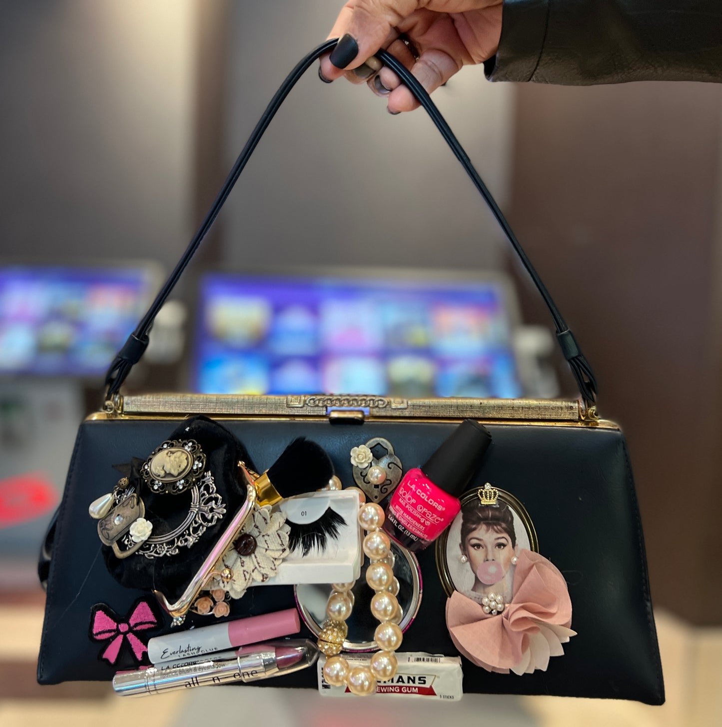 70s Styled Vintage Reworked Junk Bag Purse: Old School Nostalgia. Welcome our newest reworked bag sourced and created with lots of funky junk. This vintage-style bag is unique with one-of-a-kind wonky details. The vibe and essence of this purse have an old, old world meets new world aesthetic. It is a walking conversation piece.