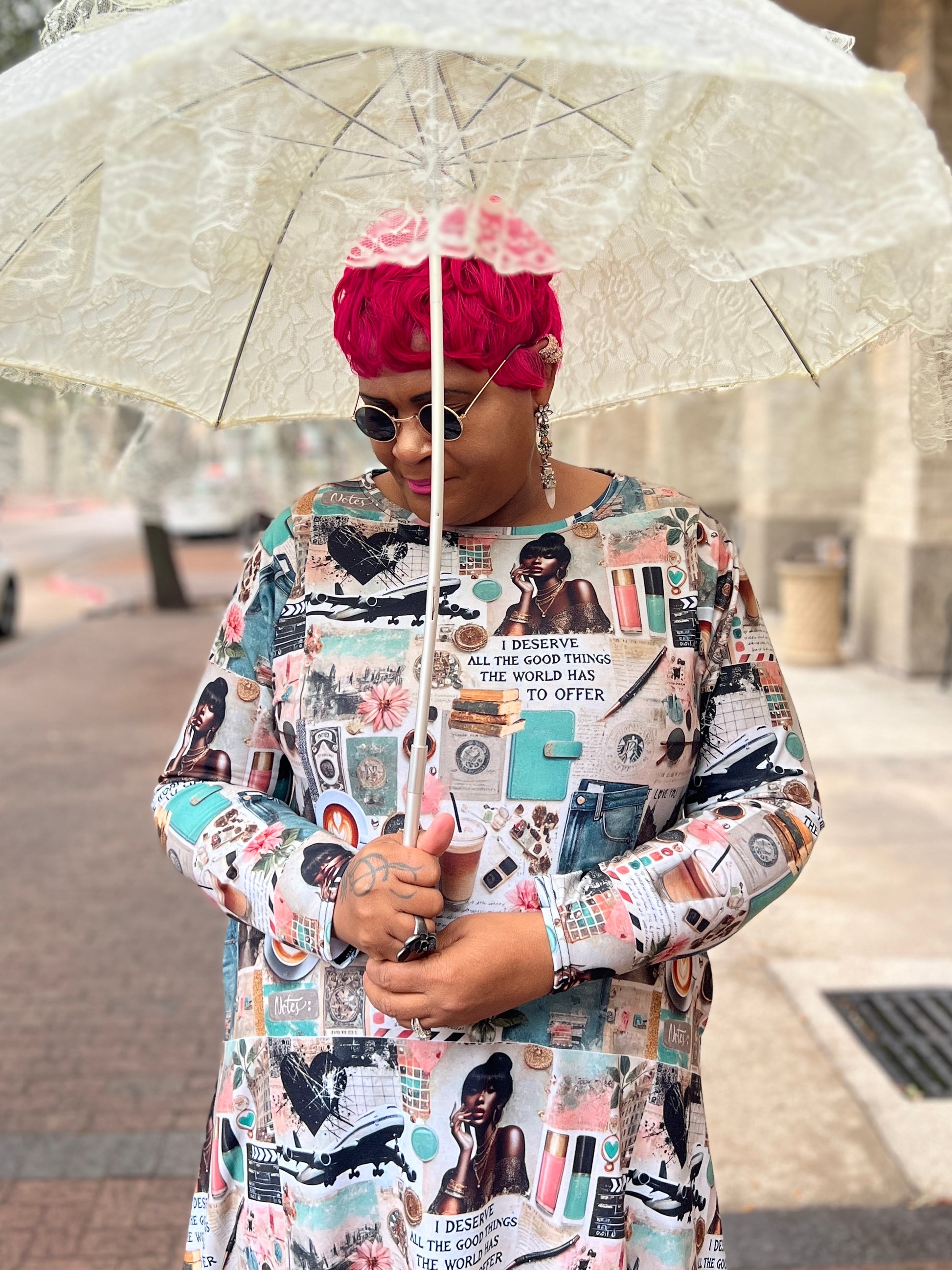 Meet your new favorite journal-style dress! It's the style that fits the journaling girls. The vibe is creating and doing everything the world has to offer. The message is clear: I Deserve All The Things The World Has To Offer.