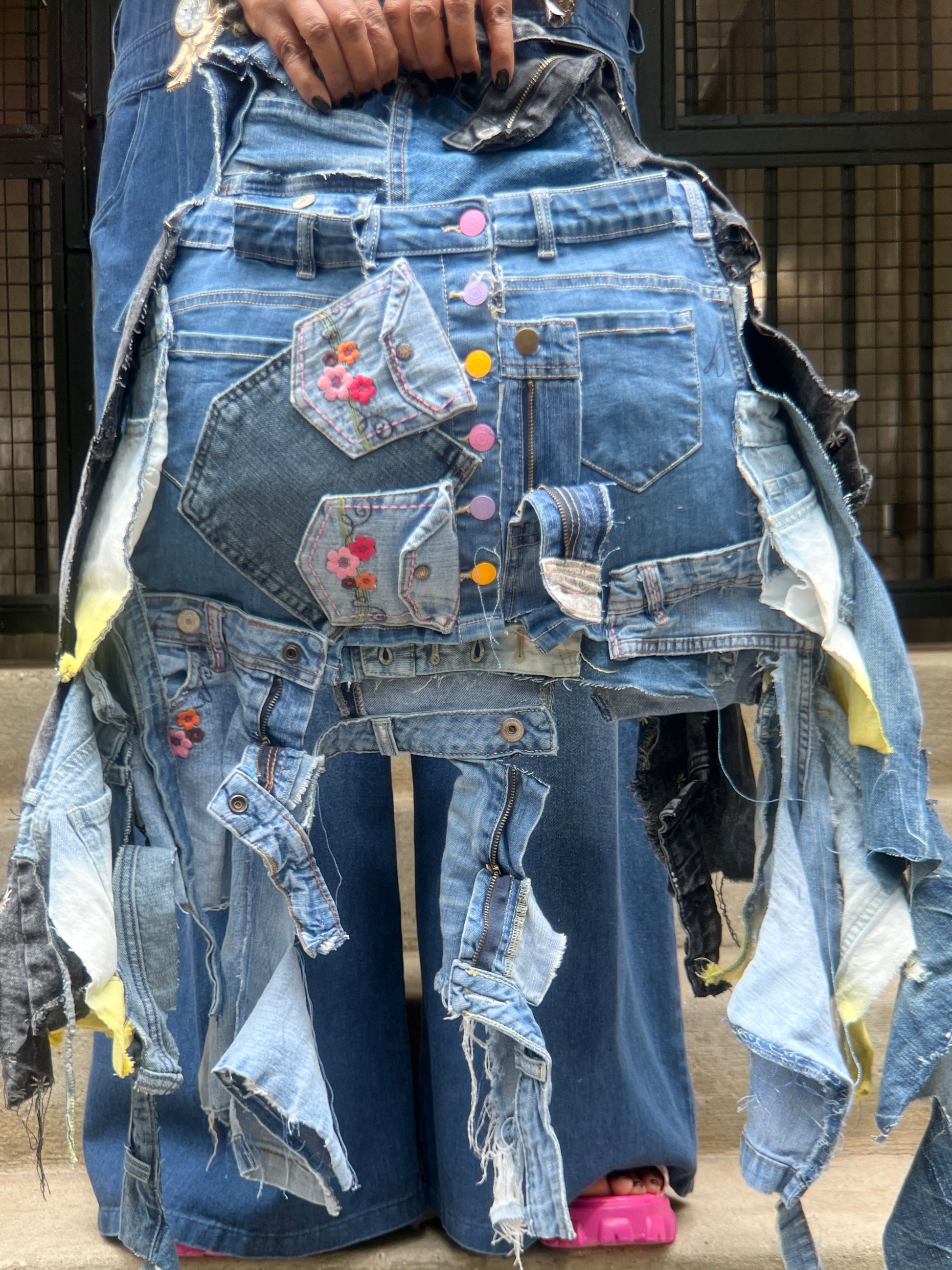 Trashy Two-Sided Color Ugly Denim Bag: Odd Style. This denim bag is handmade from secondhand, one-of-a-kind, hand-picked janky jeans. It is 100% reworked denim, ensuring no two bags are alike. This denim bag has yellow grunge dye denim and old shredded stitch pocket flowers. It's ugly, funky, and grungy, not to mention no one will have this ugly style. It's a perfect show-off bag for work, brunch, lunch, or date night dinners.