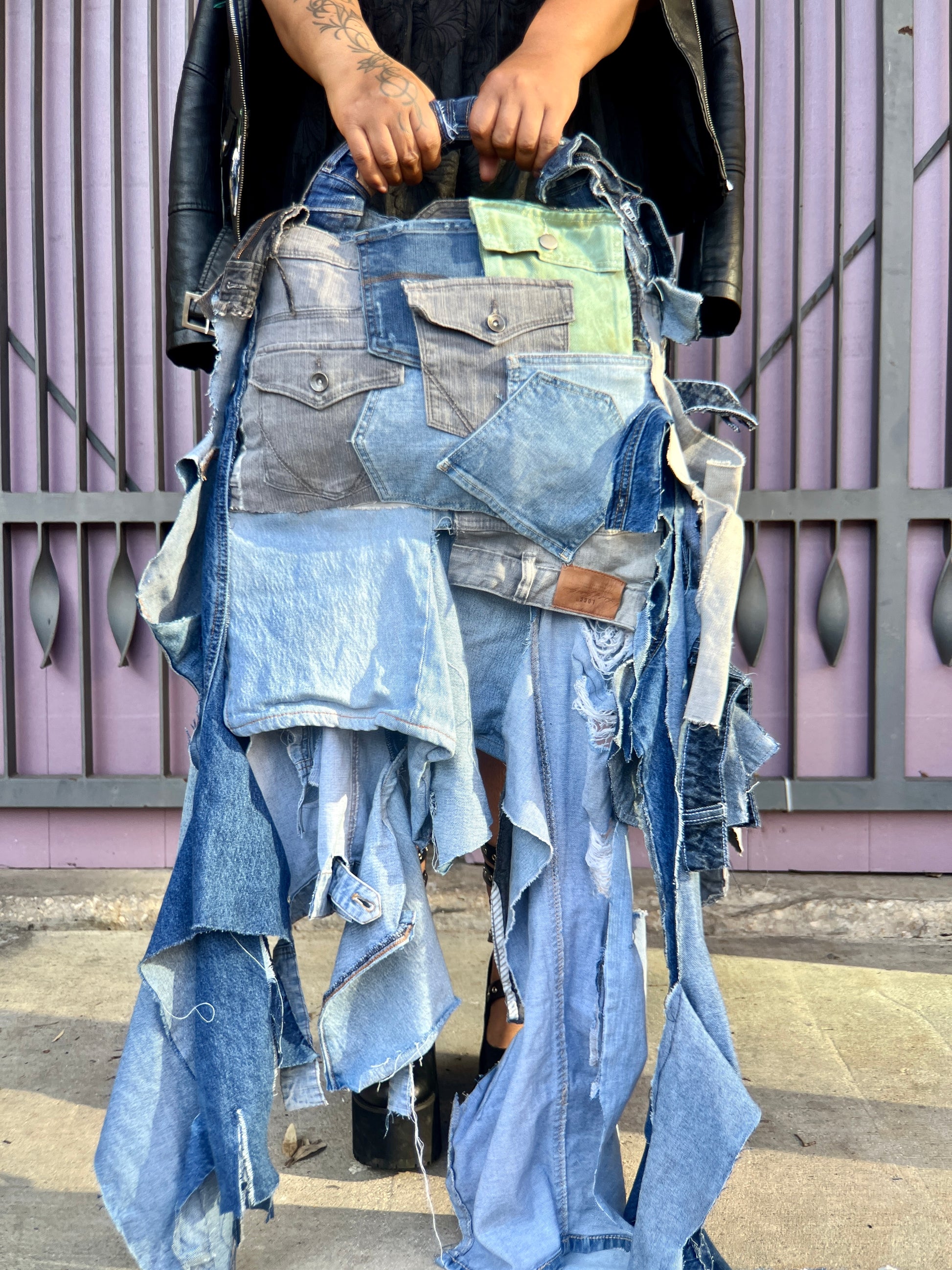 Ugly Handmade Denim Bag With Mix Matched Uneven Pockets. The statement bag doesn't need an introduction. Absolutely no one will have this crazy odd-styled denim bag that is decorated full of junk scraps, shreds, and unusable pockets. Yeah, there's no need to put pennies in those pockets because they're for fashion only. You know, performative style art.