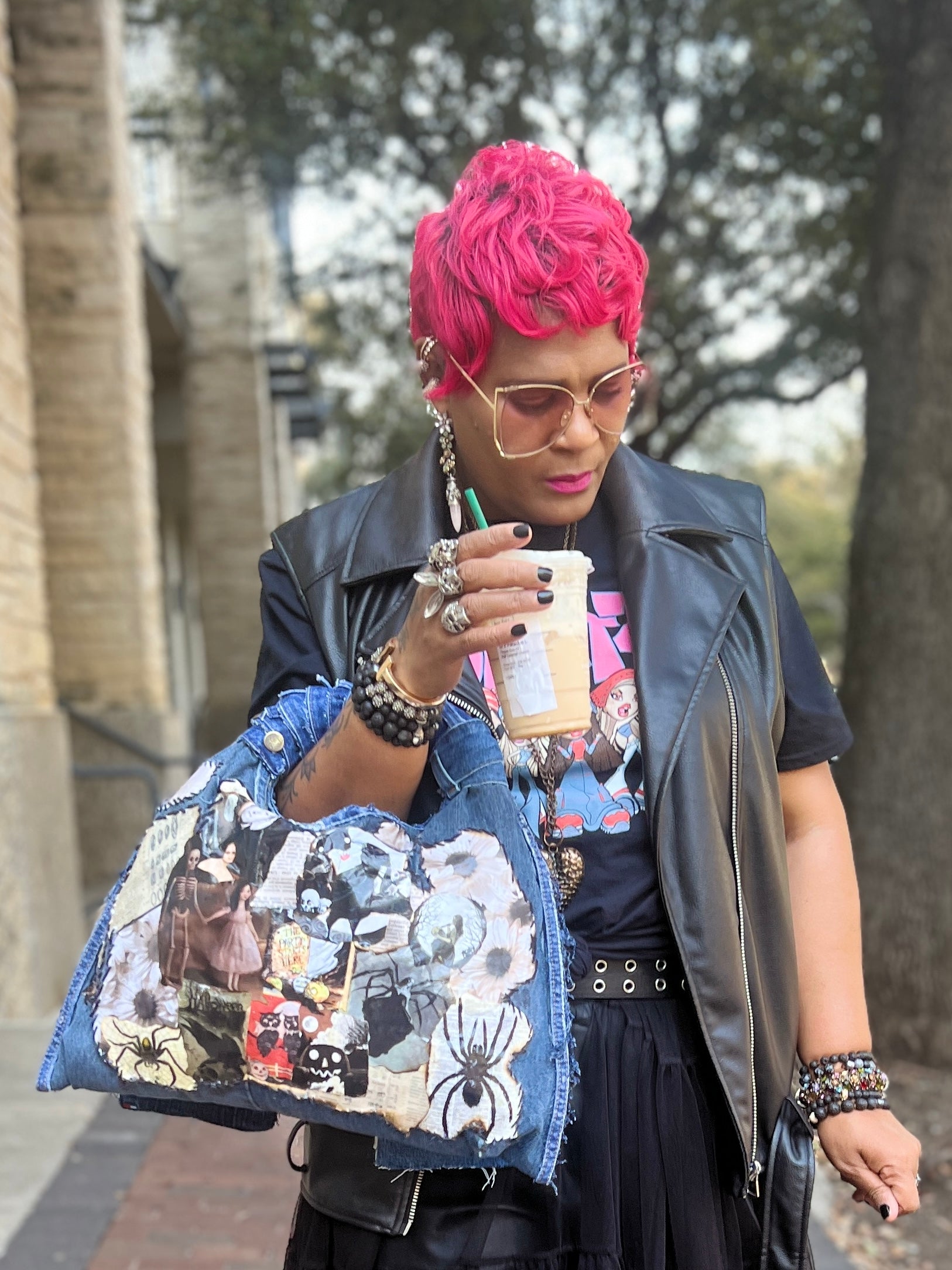 This handmade, thrifted denim bag is a work of art. Featuring Frankenstein stitches mixed with a "grunge" style, this bag is designed to appear wrinkled and torn for a unique and funky look. Oh, yes, it's UNIQUE!