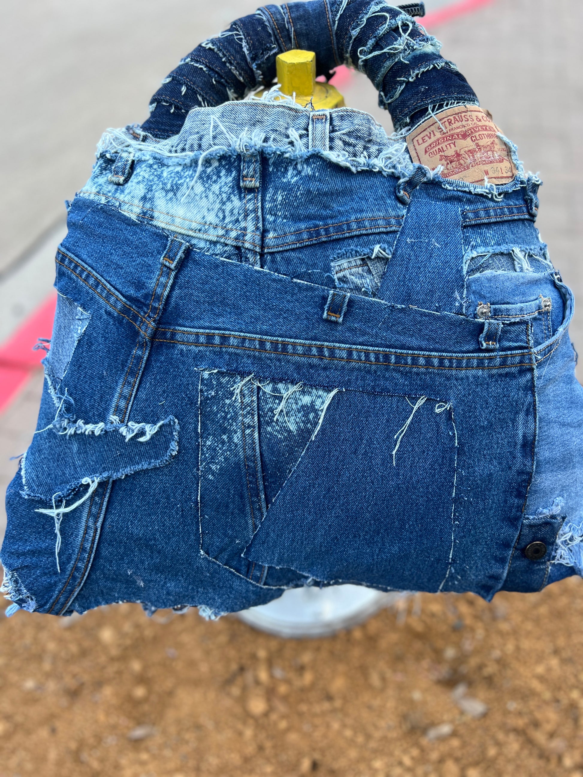 This denim bag is big, funky, and unique. One-Of-One, no two bags are the same.